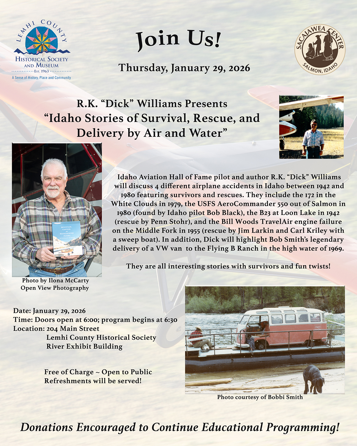 This entry was posted in education, Events, History and tagged Backcountry Flying, Lemhi County Historical Society, R.K. "Dick" Williams, River of History Exhibit, River of No Return History, Sacajawea Interpretive Center on January 14, 2026 by Hope.
