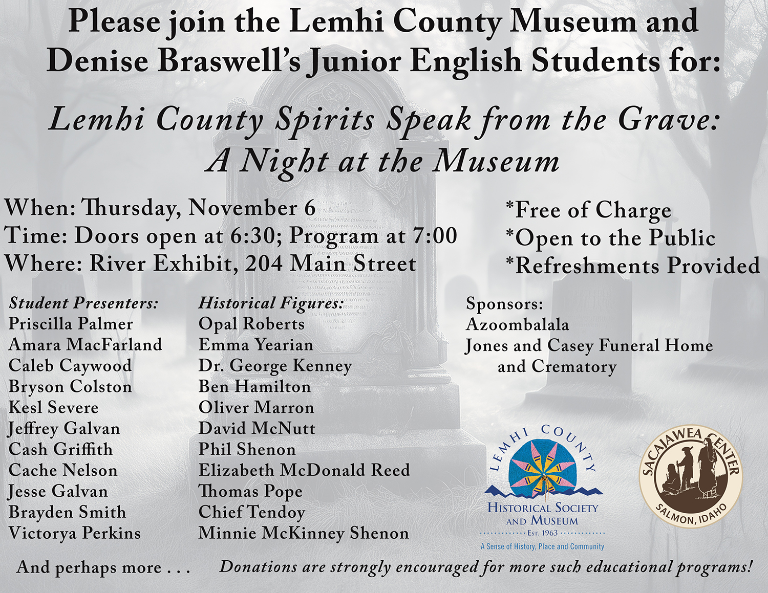 This entry was posted in Events and tagged Lemhi County Cemetery Tour: Night at the Museum, Lemhi County Historical Society, Lemhi County Museum, River Exhibit Building, Sacajawea Interpretive Center on October 30, 2025 by Hope.